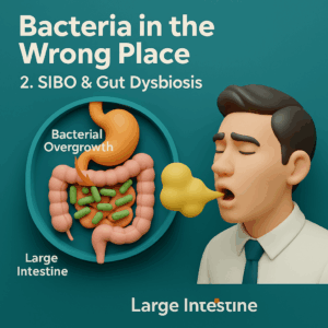 2. แบคทีเรียเติบโตผิดที่ (SIBO & Gut Dysbiosis):