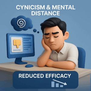 - 🧠 ความรู้สึกเหินห่างและทัศนคติเชิงลบต่องาน (Cynicism & Mental Distance) จากที่เคยรักงาน กลายเป็นความรู้สึก “หมดหวัง” (Hopelessness) หรือ “ท้อแท้” คุณเริ่มมีทัศนคติเชิงลบต่อองค์กร, เพื่อนร่วมงาน, หรือลูกค้า เริ่มแยกตัวออกจากสังคม รู้สึกว่างานที่ทำไร้ความหมาย และเริ่มหงุดหงิดง่าย นี่คือระยะที่ “ใจ” เริ่มพังทลาย
