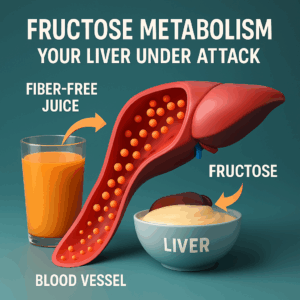 เมื่อคุณดื่มน้ำผลไม้ที่ไร้กากใย น้ำตาลฟรุกโตสปริมาณมหาศาลจะถูกดูดซึมเข้าสู่กระแสเลือดอย่างรวดเร็ว และนี่คือจุดที่ตับของคุณต้องรับบทหนัก แตกต่างจากน้ำตาลกลูโคสที่เซลล์ทั่วร่างกายสามารถนำไปใช้เป็นพลังงานได้ น้ำตาลฟรุกโตสในรูปแบบของเหลวนี้จะถูกส่งตรงไปที่ “ตับ” เพื่อจัดการเพียงที่เดียว