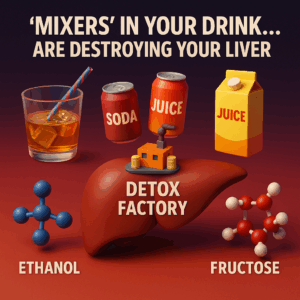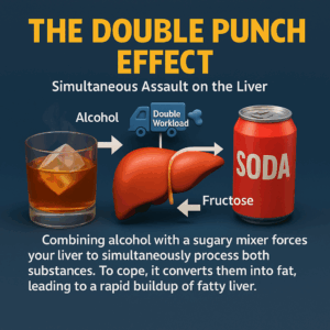 ทีนี้จินตนาการตามนะครับ… เมื่อคุณดื่มเหล้าผสมน้ำอัดลม มันก็เหมือนกับการที่คุณสั่งให้รถบรรทุก “แอลกอฮอล์” และรถบรรทุก “ฟรุกโตส” วิ่งเข้าไปที่โรงงานล้างพิษของคุณ ในเวลาเดียวกัน ตับของคุณจะเข้าสู่ภาวะทำงานหนักคูณสองทันที (Double Workload) มันต้องพยายามจัดการทั้งแอลกอฮอล์และฟรุกโตสที่ทะลักเข้ามาพร้อมกัน ผลลัพธ์คืออะไร? โรงงานทำงานไม่ทันครับ! ตับจึงเลือกทางที่ง่ายที่สุดคือ เปลี่ยนทั้งแอลกอฮอล์ส่วนเกินและฟรุกโตสส่วนเกินให้กลายเป็นไขมัน แล้วพอกสะสมไว้ในเนื้อตับของมันเอง นี่คือจุดเริ่มต้นของหายนะที่เรียกว่า “ภาวะไขมันพอกตับ” (Fatty Liver) ซึ่งเกิดขึ้นได้เร็วกว่าการดื่มเหล้าเพียวๆ ด้วยซ้ำ