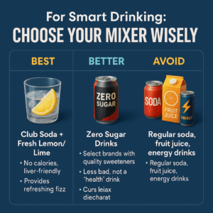 • ดีที่สุด: โซดาเปล่า + มะนาว/เลมอนฝานสด ไม่มีแคลอรี ไม่ทำร้ายตับ ให้ความซ่าสดชื่น