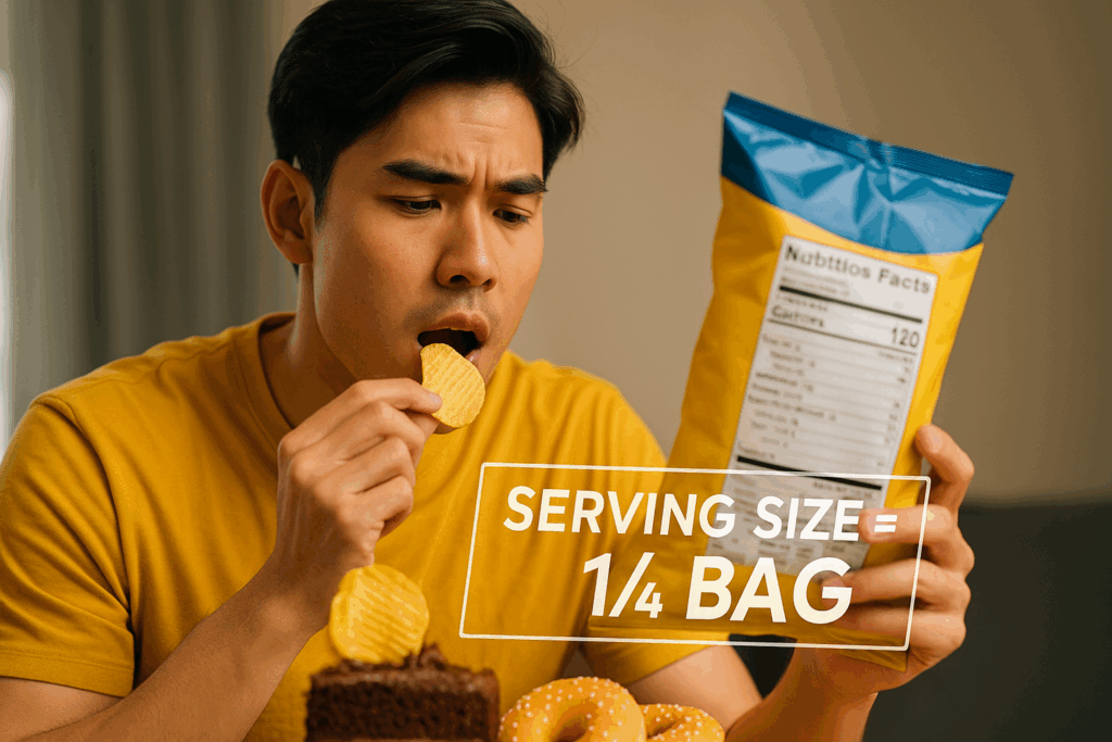 1️⃣ พลิกกล่องดู Serving Size ก่อน — คูณให้ครบเท่าที่คุณกินจริง