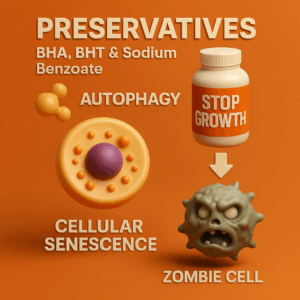 สารกันบูดอย่าง BHA, BHT และ Sodium Benzoate ถูกออกแบบมาเพื่อ “หยุดการเติบโตของสิ่งมีชีวิตขนาดเล็ก” เช่น แบคทีเรียและรา แต่เมื่อเข้าสู่ร่างกายมนุษย์ มันอาจส่งผลคล้ายกันกับ “เซลล์ของเรา” ทำให้ระบบรีไซเคิลเซลล์ที่ชื่อว่า Autophagy (ออโตฟาจี) ทำงานแผ่วลง