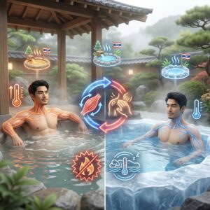 The Science: การแช่น้ำร้อนทำให้หลอดเลือดขยายตัว เลือดไหลเวียนดี แล้วตามด้วยน้ำเย็นเพื่อให้หลอดเลือดหดตัว การทำสลับกันช่วย “ปั๊ม” ของเสียออกจากกล้ามเนื้อ ลดการอักเสบ (Inflammation) ซึ่งเป็นสาเหตุหลักของความชรา และช่วยปรับ Core Body Temperature ให้นอนหลับได้สนิทที่สุด