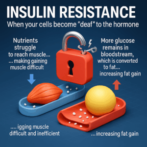 นี่คือผลกระทบที่อันตรายที่สุดครับ! อินซูลินคือฮอร์โมนที่ทำหน้าที่เหมือน “กุญแจ” ไขประตูเซลล์เพื่อนำสารอาหาร (จากอาหารที่เรากิน) เข้าไปเลี้ยงกล้ามเนื้อ การที่คุณอัดอาหารขยะเข้าไปตลอดเวลา ก็เหมือนการกระแทกประตูเซลล์ซ้ำๆ จน “รูกุญแจพัง” เซลล์จึงเริ่ม “ดื้อ” ต่ออินซูลิน (Insulin Resistance)