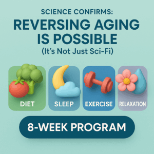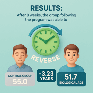 ผลลัพธ์: หลังจาก 8 สัปดาห์ กลุ่มที่ปฏิบัติตามโปรแกรมนี้ สามารถ “ย้อน” อายุชีวภาพ (วัดผลจาก DNAmAge หรือ “นาฬิกาชีวภาพ”) ของตัวเองลงได้เฉลี่ย 3.23 ปี เมื่อเทียบกับกลุ่มควบคุม