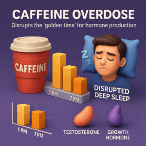 แม้คุณจะ “นอนหลับ” ได้ แต่คาเฟอีนที่ยังตกค้างอยู่จะรบกวน “คุณภาพ” การนอนหลับลึก (Deep Sleep) ของคุณ ซึ่งช่วงเวลาที่คุณหลับลึกนี่เองคือ “เวลาทอง” ที่ร่างกายจะผลิตฮอร์โมนสำคัญที่สุดสองชนิดคือ เทสโทสเตอโรน และ โกรทฮอร์โมน (Growth Hormone) การทำลายการนอนหลับ ก็คือการทำลายโอกาสที่ร่างกายจะซ่อมแซมและสร้างฮอร์โมนความเป็นชายของคุณ