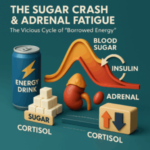 แต่ที่เลวร้ายกว่านั้นคือ วงจรที่แกว่งไปมานี้สร้างภาระหนักให้กับ “ต่อมหมวกไต” (Adrenal Glands) ซึ่งเป็นโรงงานผลิตฮอร์โมนความเครียด (Cortisol) และฮอร์โมนแห่งพลัง (Adrenaline) การกระตุ้นมันซ้ำๆ ด้วยเครื่องดื่มชูกำลัง ก็เหมือนการที่คุณสตาร์ทเครื่องปั่นไฟสำรองของร่างกายไม่หยุดหย่อน จนในที่สุดมันก็ “น็อก” หรือที่เรียกว่าภาวะ “Adrenal Fatigue” (ต่อมหมวกไตล้า) ซึ่งเป็นสาเหตุของความเหนื่อยล้าเรื้อรังที่แก้ไม่หาย