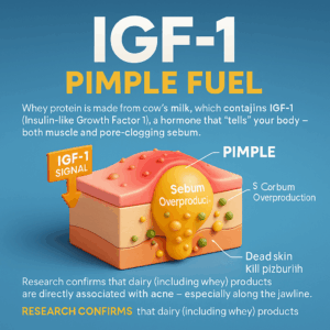 IGF-1 ไปกระตุ้นให้ต่อมไขมันผลิตน้ำมันมากเกินไป (Sebum Overproduction) ผสมกับเซลล์ผิวที่ตายแล้วและแบคทีเรีย → เกิดการอุดตันและอักเสบ จนกลายเป็นสิว โดยเฉพาะบริเวณกราม คาง และแนวกรอบหน้า ซึ่งเป็นจุดที่มีตัวรับฮอร์โมนเพศชายเยอะที่สุด