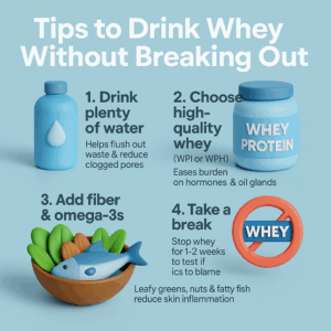 งานวิจัยทางผิวหนังหลายชิ้นยืนยันแล้วว่า ผลิตภัณฑ์จากนม (รวมถึงเวย์โปรตีน) มีความสัมพันธ์โดยตรงกับการเกิดสิว โดยเฉพาะในกลุ่มวัยทำงานและนักฟิตเนสที่ดื่มเวย์เป็นประจำ