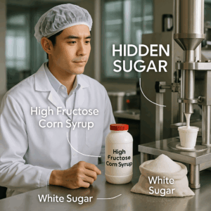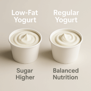 เห็นความแตกต่างไหมครับ? คุณเลี่ยงไขมันไป 10 กรัม แต่กลับต้องรับน้ำตาลเพิ่มเข้ามาถึง 14 กรัม ซึ่งเป็นน้ำตาลแปรรูปที่ทำลายสุขภาพโดยตรง โยเกิร์ตไขมันต่ำถ้วยนั้น แท้จริงแล้วมันคือ “พุดดิ้งน้ำตาล” ที่ปลอมตัวมาในคราบอาหารสุขภาพ