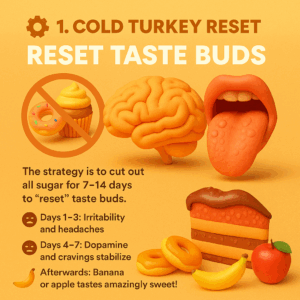 🧠 กลยุทธ์คือ “หักดิบ” น้ำตาลทั้งหมด 7–14 วัน เพื่อให้ปุ่มรับรสกลับมา “รีเซ็ต”