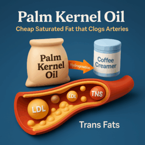 น้ำมันปาล์มเคอร์เนลเป็นไขมันอิ่มตัวเกรดอุตสาหกรรมราคาถูก ที่มีส่วนในการเพิ่มระดับคอเลสเตอรอลชนิดเลว (LDL) ของคุณ แต่ที่เลวร้ายกว่านั้นคือ กระบวนการเติมไฮโดรเจนบางส่วน (Partially Hydrogenated) คือกระบวนการที่ก่อให้เกิด “ไขมันทรานส์” (Trans Fat) โดยตรง แม้ฉลากอาจจะเขียนว่า “ไขมันทรานส์ 0 กรัม” จากช่องโหว่ทางกฎหมายที่อนุญาตให้ปัดเศษทิ้งได้ แต่การมีอยู่ของ “Hydrogenated Oil” ก็คือธงแดงที่บอกว่ามีสารพิษต่อหลอดเลือดชนิดนี้ปะปนอยู่แน่นอน