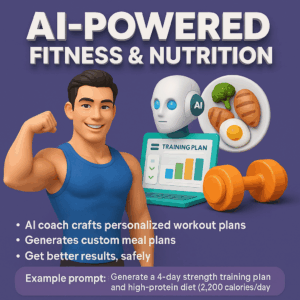 สุขภาพคือรากฐานของทุกความสำเร็จ แต่การจ้างเทรนเนอร์ส่วนตัวอาจมีค่าใช้จ่ายสูง ข่าวดีคือ AI สามารถทำหน้าที่เป็น “โค้ชสุขภาพและฟิตเนส” ส่วนตัวของคุณได้ มันสามารถสร้างโปรแกรมการออกกำลังกายและแผนการรับประทานอาหารที่ปรับให้เข้ากับเป้าหมาย, สภาพร่างกาย หรือแม้กระทั่งอาการบาดเจ็บเฉพาะตัวของคุณได้อย่างน่าทึ่ง มีรายงานว่าผู้ใช้สามารถลดน้ำหนักได้อย่างมีนัยสำคัญด้วยแผนที่สร้างจาก AI โดยที่ไม่ต้องอดอาหารที่ชอบเลยด้วยซ้ำ