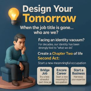 - เผชิญหน้ากับสุญญากาศทางตัวตน: เป็นเวลาหลายสิบปีที่ “ตัวตน” ของเราผูกพันอย่างแน่นแฟ้นกับ “สิ่งที่เราทำ” การเกษียณจึงไม่ใช่แค่การหยุดทำงาน แต่เป็นการสูญเสียตัวตนส่วนสำคัญ ซึ่งสามารถนำไปสู่ความรู้สึกเบื่อหน่าย ไร้ทิศทาง และซึมเศร้าได้