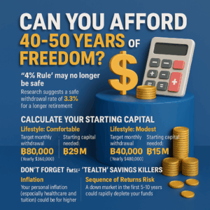 - “กฎ 4%” อาจไม่ปลอดภัยอีกต่อไป: กฎการเงินยอดนิยมที่ให้ถอนเงินปีละ 4% ของพอร์ตลงทุน ถูกออกแบบมาสำหรับระยะเวลาเกษียณ 30 ปี แต่สำหรับคนเกษียณเร็วที่ต้องใช้เงินยาวนานกว่านั้น งานวิจัยจากสถาบันการเงินชั้นนำชี้ว่าอัตราการถอนที่ปลอดภัย ควรจะลดลงมาอยู่ที่ประมาณ 3.3% เท่านั้น