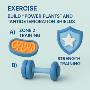 - A) สร้าง “โรงไฟฟ้า” ด้วย Zone 2 Training: ไมโตคอนเดรีย (Mitochondria) คือโรงไฟฟ้าในเซลล์ที่สร้างพลังงาน วิธีเพิ่มจำนวนและประสิทธิภาพของมันคือการออกกำลังกายแบบ Zone 2 ซึ่งเป็นการออกกำลังกายเบาๆ แต่นาน (30-60 นาที) เช่น เดินเร็ว, จ็อกกิง, ปั่นจักรยาน ให้หัวใจเต้นในระดับที่ยังสามารถพูดคุยเป็นประโยคได้ การฝึกแบบนี้จะสอนให้ร่างกายดึง “ไขมัน” มาใช้เป็นพลังงานและกระตุ้นการสร้างโรงไฟฟ้าใหม่