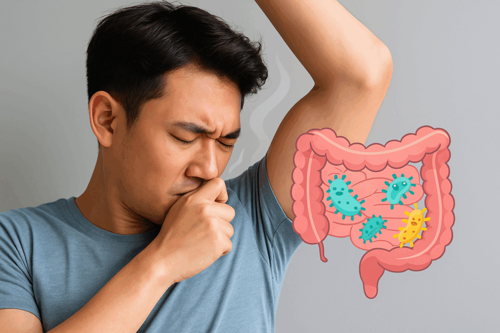 ปัญหากลิ่นตัวที่แก้ไม่หาย แท้จริงแล้วมักเริ่มจาก “ลำไส้” ครับ เมื่อเรากินน้ำตาลและอาหารแปรรูปมากไป จะทำให้แบคทีเรียเลวในลำไส้เติบโต (ภาวะ Gut Dysbiosis) พวกมันจะย่อยอาหารขยะและปล่อยของเสียมีกลิ่นเหม็น (สาร VOCs) ออกมา สารพิษนี้จะซึมเข้าสู่กระแสเลือด และถูกร่างกายขับออกมาทางเหงื่อ ทำให้เกิดกลิ่นตัวรุนแรงนั่นเอง