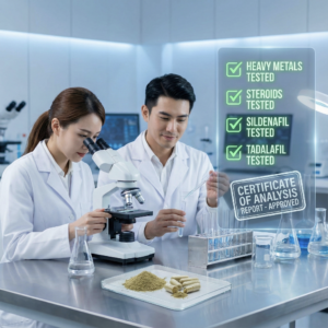 ตรวจสอบว่าผลิตภัณฑ์นั้นผ่านการทดสอบจากห้องปฏิบัติการที่น่าเชื่อถือ: เช่น Thailand Central Lab หรือหน่วยวิเคราะห์กลางอื่นๆ เพื่อยืนยันว่าไม่มีการปนเปื้อนของสารอันตรายใดๆ ในผลิตภัณฑ์นั้น สารต้องห้ามที่มักพบลักลอบใส่ในอาหารเสริมที่ไม่ได้มาตรฐาน ได้แก่ โลหะหนัก (เช่น ตะกั่ว, ปรอท), สเตียรอยด์ (ยาแก้อักเสบที่บางผู้ผลิตอาจผสมเพื่อให้เห็นผลเร็ว) และยากลุ่มรักษาอาการหย่อนสมรรถภาพทางเพศ เช่น ซิลเดนาฟิล (Sildenafil) หรือ ทาดาลาฟิล (Tadalafil) สารเหล่านี้เป็นอันตรายและผิดกฎหมายที่จะผสมลงในผลิตภัณฑ์เสริมอาหาร ผู้บริโภคจึงควรเลือกผลิตภัณฑ์ที่มีใบผลการตรวจวิเคราะห์ยืนยันว่าไม่มีสารต้องห้ามเจือปน เพื่อความปลอดภัยของตนเอง