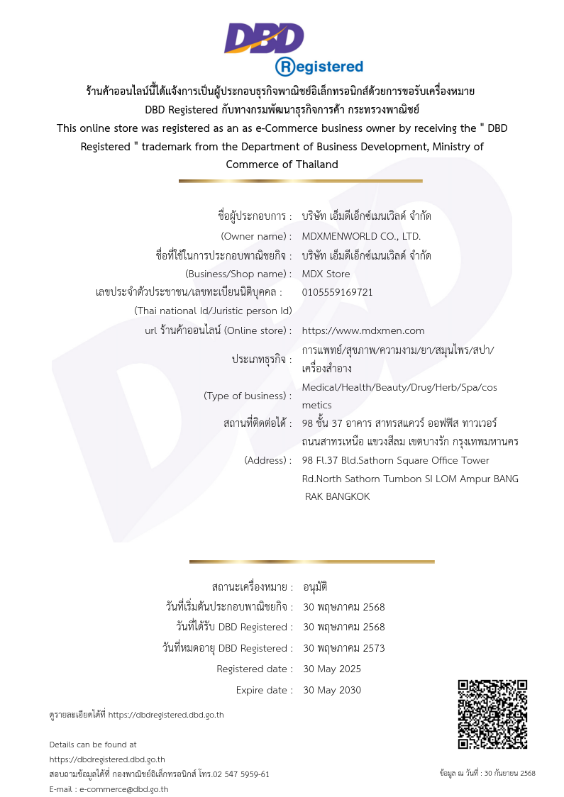 นอกจากนี้ MDX S ยังผ่านการรับรองมาตรฐานต่างๆ ครบถ้วน ผลิตภัณฑ์ผ่านการรับรองจาก อย. เลขที่ 74-1-07455-5-1041 มีเครื่องหมายฮาลาล, GMP, HACCP และผ่านการตรวจสอบจาก Thailand Central Lab ว่าไม่มีสารอันตรายเจือปน ผู้ใช้จึงมั่นใจได้ในความปลอดภัยแม้จะต้องการผลลัพธ์ที่ฉับไวก็ตาม