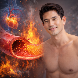 ศัตรูที่น่ากลัวที่สุดของผู้ชายไม่ใช่ไขมัน แต่คือ Chronic Inflammation (การอักเสบเรื้อรัง) มันคือไฟกองเล็กๆ ที่ลุกไหม้ในระดับเซลล์ตลอดเวลาโดยที่คุณไม่รู้ตัว การอักเสบนี้ทำลาย Endothelium (ผนังชั้นในสุดของหลอดเลือด) ทำให้เกิดรอยฉีกขาดเล็กๆ ร่างกายจึงต้องส่งคอเลสเตอรอลไป “อุด” รอยรั่วนั้น นานวันเข้ามันกลายเป็นคราบพลัค (Plaque) ที่นำไปสู่ภาวะหัวใจขาดเลือด