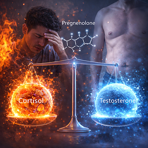 The Testosterone Steal (การปล้นเทสโทสเตอโรน): ความเครียดไม่ใช่เรื่องนามธรรม แต่เป็นศัตรูทางเคมีของผู้ชาย ร่างกายเราใช้วัตถุดิบตัวเดียวกัน (Pregnenolone) ในการสร้างทั้งฮอร์โมนเครียด (Cortisol) และฮอร์โมนเพศชาย (Testosterone)