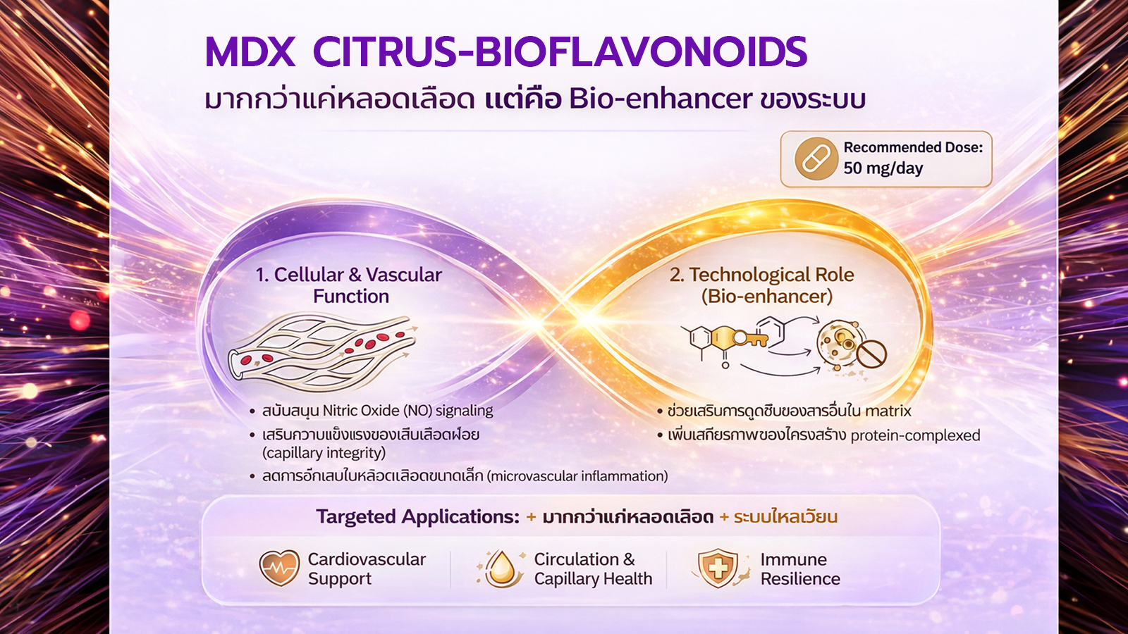 QCG Matrix ที่อยู่ใน MDX Pro เกิดจากการรวมตัวของ 3 สกัด Quercetin ปริมาณ 100mg – Citrus Bioflavonoids ปริมาณ 50mg – Grapde Seed (Resveratrol) ปริมาณ 100mg รวม 250mg. ซึ่งเป็นปริมาณที่เหมาะสม เพื่อให้ระบบนำส่งสารสกัดเข้าสู่เซลล์ ทำงานได้อย่างมีประสิทธิภาพ