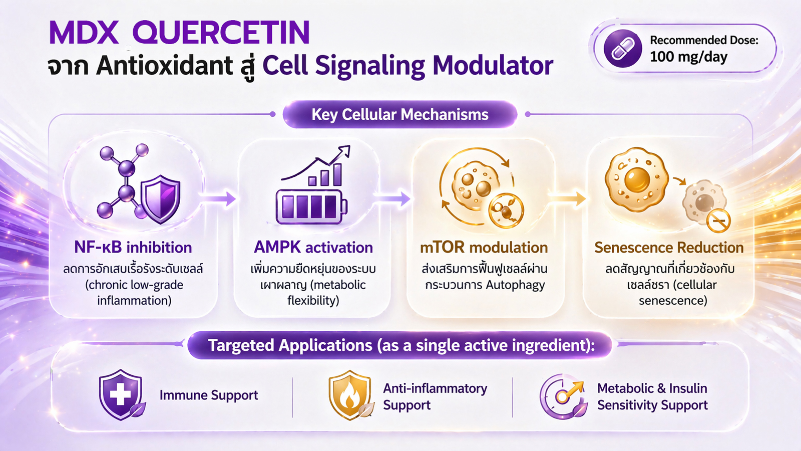 อายุยืน Longevity : บำรุงสุขภาพแบบองค์รวมทุกระบบ นำทัพโดย QCG Matrix การรวมตัวของ 3 สกัด Quercetin – Citrus Bioflavonoids – Grapde Seed (Resveratrol) ควบคุมการอักเสบ ฟื้นฟูกระบวนการ Autophagy ลดสัญญาณความชรา ดูแล SIRT1 ควบคุมอายุชีวภาพของเซลล์ เสริมพลังด้วย Curcumin (ขมิ้นชัน) ลดการแพร่กระจายมะเร็ง Lycopene ป้องกันมะเร็ง Pomeganate (ทับทิม) ทำให้เซลล์มะเร็งตาย