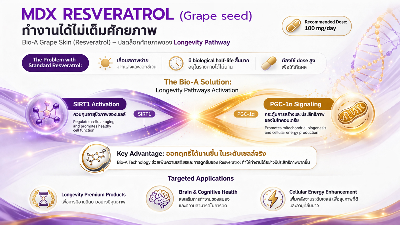 เราใช้นวัตกรรม CellMatrix ที่ได้รับรางวัลระดับนานาชาติจากประเทศดูไบ โดยอาศัยรากฐานจากรางวัลโนเบล ด้าน Cell biology, Membrane transport, Intracellular signaling ในปี 1999 เข้ามาเป็นแกนหลักของสูตรแบบบูรณาการ” (Synergy Formula)