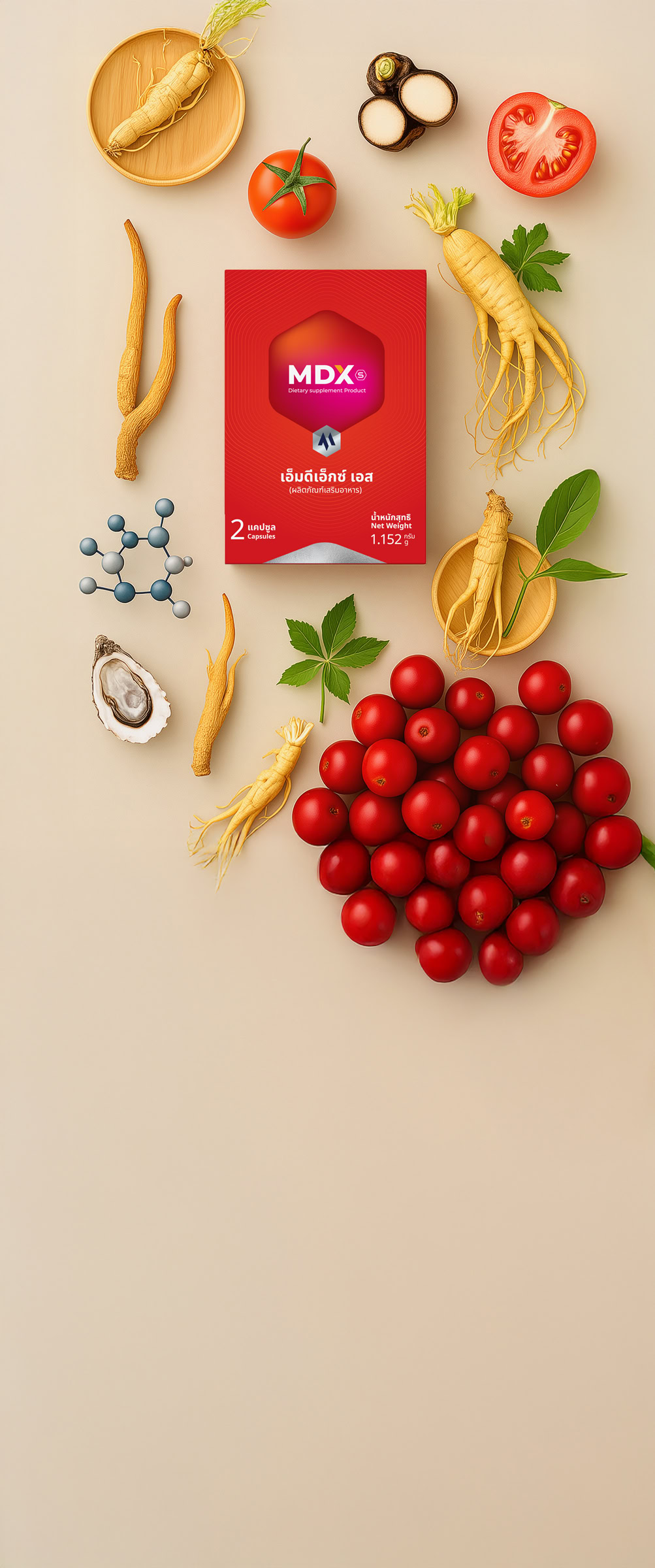 MDX S ผสม : แอล-อาร์จินิน สารสกัดจากโสม สารสกัดจากตังถั่งเช่า สารสกัดจากหอยนางรม สารสกัดจากโหงวบี่จี ซิงก์เมไธโอนีน (ให้ซิงก์ 12%) สารสกัดจากกระชายดำ ไลโคปีน 10% ไนอะซินาไมด์ ดี-แพนโททีเนต แคลเซียม 90% ไพริดอกซีนไฮโดรคลอไรด์ วิตามินบี 12 (0.1%) ไรโบฟลาวิน ไทอะมีนไฮโดรคลอไรด์ กรดโฟลิก 10% ดี-ไบโอติน