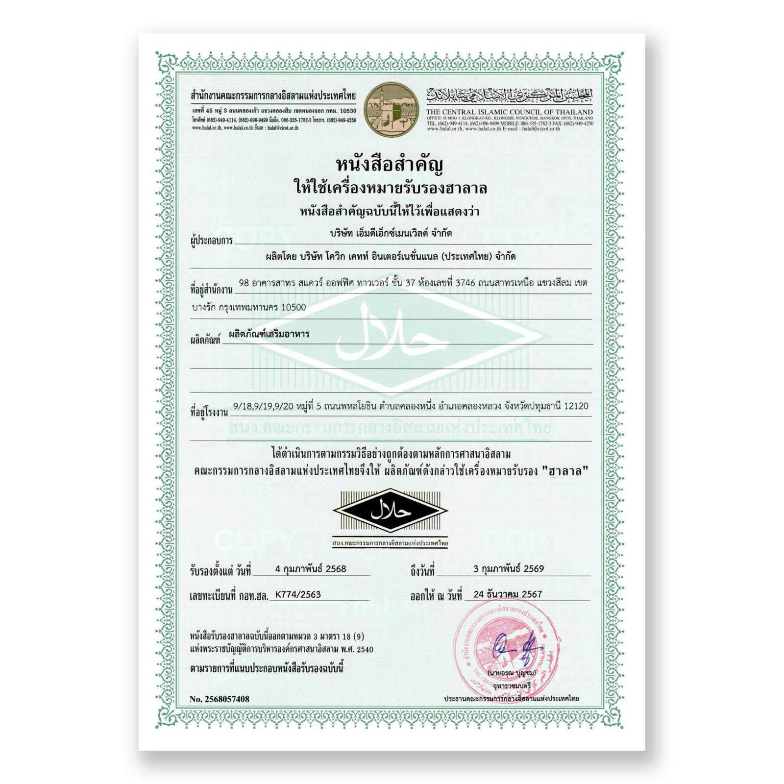 ⦿ อย. 13-1-02954-5-0296 ฮาลาล GMP