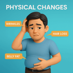 * สัญญาณ: ริ้วรอยถามหา ผมเริ่มบาง และที่ชัดที่สุดคือ “ลงพุง” (ไขมันรอบเอวที่ลดยากขึ้น เพราะฮอร์โมนเทสโทสเตอโรนลดต่ำลง)