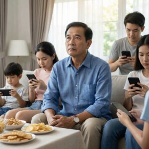 ลูกหลานพากันมาเยี่ยมในวันหยุด ขนมนมเนยเต็มโต๊ะ แต่ทุกคนก้มหน้าก้มตาจิ้มโทรศัพท์มือถือ พอท่านเอ่ยปากถามไถ่ ก็ได้รับคำตอบสั้นๆ ว่า “ครับ/ค่ะ” แล้วบทสนทนาก็จบลง ปล่อยให้ท่านนั่งมองเพดานท่ามกลางความเงียบที่มีเสียงทีวีเป็นเพื่อน