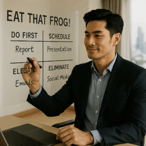 - ใช้กฎ 80/20 เพื่อหา “กบตัวใหญ่ที่สุด”: หลักการพาเรโต (Pareto Principle) ชี้ว่า 80% ของผลลัพธ์มาจาก 20% ของการกระทำ ในแต่ละวัน จงระบุ “งานที่สำคัญที่สุด 20%” (กบตัวใหญ่) ที่จะสร้างผลกระทบได้มากที่สุด แล้วลงมือทำมันเป็นอย่างแรก การทำเช่นนี้จะสร้างแรงส่งมหาศาลและทำให้การ “ถอดปลั๊ก” ในช่วงท้ายวันเป็นเรื่องง่ายขึ้น